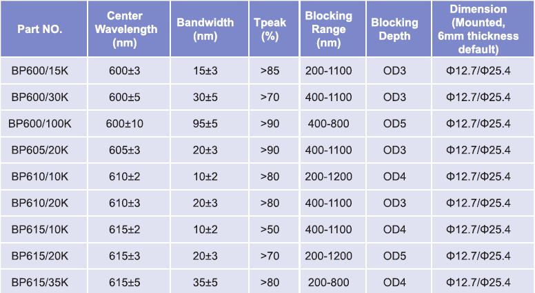 帶通濾光片波長范圍:600nm-615nm