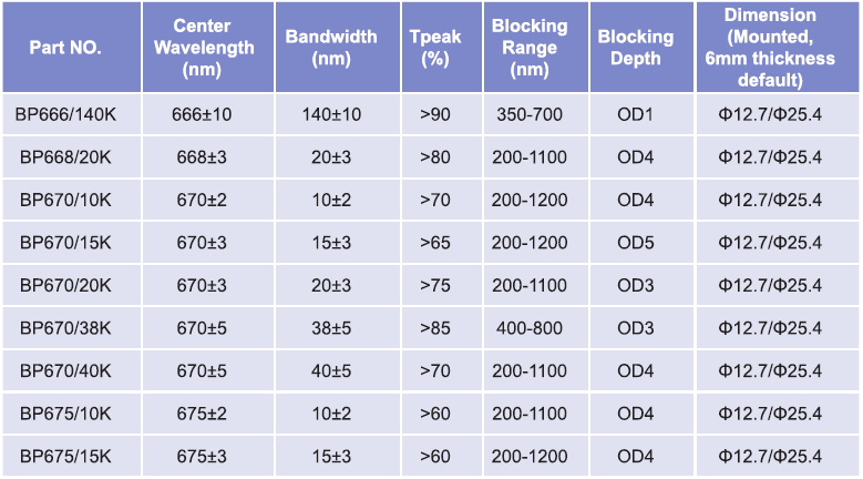 帶通濾光片波長范圍:665nm-675nm
