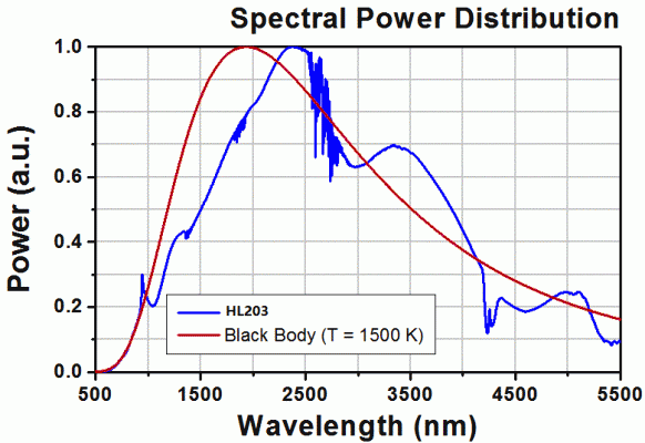 HL203 類鹵鎢燈光源光源具有在500 至9000 nm 間的恒定光強,>1.5 W 的黑體輻射光譜。由于該黑體光譜覆蓋了可見光和中紅外光譜范圍,這個光源是集成到中紅外測量和分析系統(tǒng)的理想選擇。它使用了一個位于橢球反射器內(nèi)的碳化硅棒,以增大光輸出。一個CaF2 透鏡準直光源發(fā)射的光。包含的自定義濾光片支架加工成匹配光源外殼的高度,并且也經(jīng)過了紅色陽氧化處理。