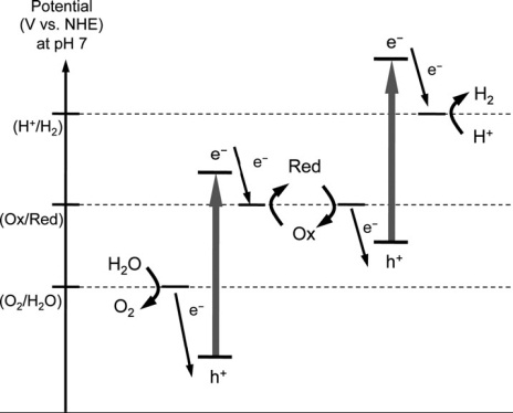 圖4.粉體催化劑光分解水制氫示意圖[1]   圖5.兩步法分解水示意圖[2]