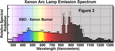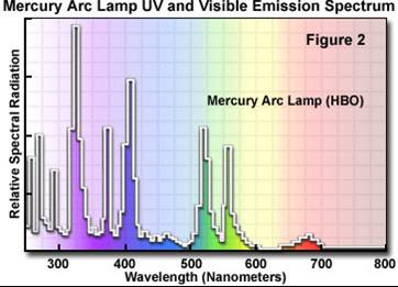 氙燈和汞燈做為白光源,都能提供從紫外到近紅外一系列波長的光,但它們卻有著不同的激發(fā)光譜。汞燈集中在近紫外、藍(lán)光以及綠光附近,這種在峰值的高激發(fā)能量確保產(chǎn)生明亮的熒光信號(hào),但光毒性卻很強(qiáng)。因此,HBO用來對(duì)固定樣品或弱熒光成像。相比而言,氙燈光源的激發(fā)比較平緩,可以用于不同波長間強(qiáng)度的比較,例如用于鈣離子濃度測量等。氙燈的強(qiáng)激發(fā)在近紅外800-1000nm。