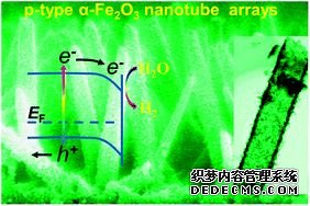 中科院理化所師文生課題組在具有ZnO陣列的FTO上,用電沉積的方式制備了FeOOH,通過(guò)高溫離子擴(kuò)散的方式使Zn2+摻雜入Fe2O3, 后去除ZnO模板獲得了p型Zn2+摻雜Fe2O3的空心納米管光陰,并展現(xiàn)出了較高的開(kāi)啟電勢(shì)。(上圖,DOI:10.1039/C3CC40599K)