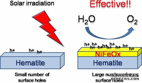 但目前在Fe2O3上降低開(kāi)啟電勢(shì)有效的催化劑為NiFeOx。關(guān)于Fe2O3的開(kāi)啟電勢(shì)差,Dunwei Wang課題組認(rèn)為是由于Fe2O3大量的表面態(tài)導(dǎo)致費(fèi)米能級(jí)釘扎,通過(guò)NiFeOx助催化劑的引入,大程度降低了表面費(fèi)米能級(jí)的釘扎效應(yīng),因此獲得了較好的開(kāi)啟電勢(shì)。(上圖,DOI:10.1002/anie.201306263)