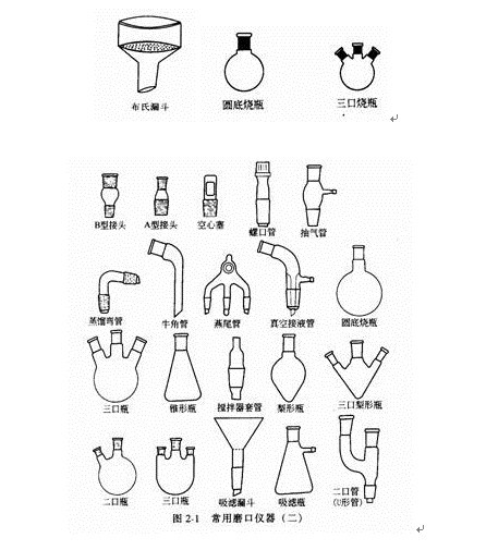 在精細(xì)有機(jī)合成實(shí)驗(yàn)中使用的一般為標(biāo)準(zhǔn)磨口玻璃儀器。它的用途、容量不同,應(yīng)注意標(biāo)準(zhǔn)磨口有不同的編號,如 10 號、 14 號、 19 號、 24 號、 9 號和 34 號等。這些編號是指磨口大端的直徑 ( 單位為 mm ,取接近的整數(shù) ) 。洗滌磨口時不得用粗糙的去污粉,以免使磨口擦傷而漏氣。進(jìn)行真空減壓操作時,磨口處應(yīng)涂以真空潤滑脂,以免漏氣。一般用途可不涂潤滑脂,以免砧污反應(yīng)物或產(chǎn)物。若反應(yīng)中有強(qiáng)堿,則應(yīng)涂潤滑劑,以免磨口連接處因堿腐蝕粘牢而無法拆開。精細(xì)合成實(shí)驗(yàn)所需常用玻璃儀器見圖 2-1 。