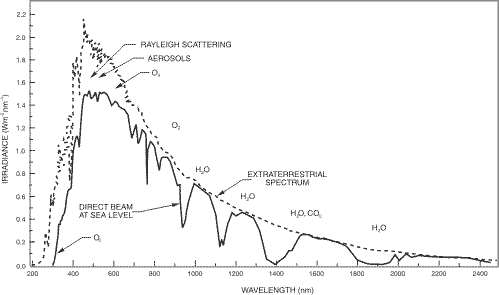 標(biāo)準(zhǔn)太陽(yáng)光譜和穿透大氣層到達(dá)地球表面的太陽(yáng)光譜如下: