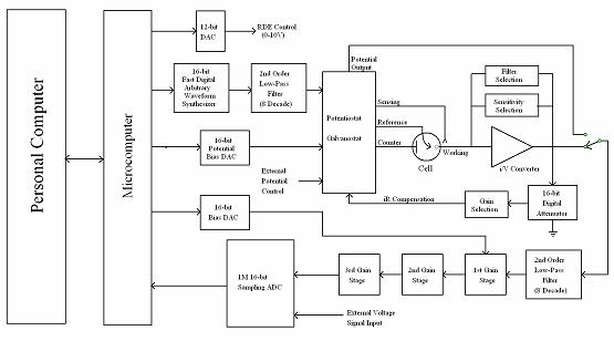 600E為通用電化學測量系統(tǒng)。下圖為儀器的硬件結構示意圖。儀器內(nèi)含快速數(shù)字信號發(fā)生器,用于高頻交流阻抗測量的直接數(shù)字信號合成器,雙通道高速數(shù)據(jù)采集系統(tǒng),電位電流信號濾波器,多級信號增益,iR降補償電路,以及恒電位儀/恒電流儀(660E)。電位范圍為10V,電流范圍為250mA。電流測量下限低于10pA?芍苯佑糜诔㈦娚系姆(wěn)態(tài)電流測量。如果與 200B微電流放大器及屏蔽箱連接,可測量1pA或更低的電流。如果與