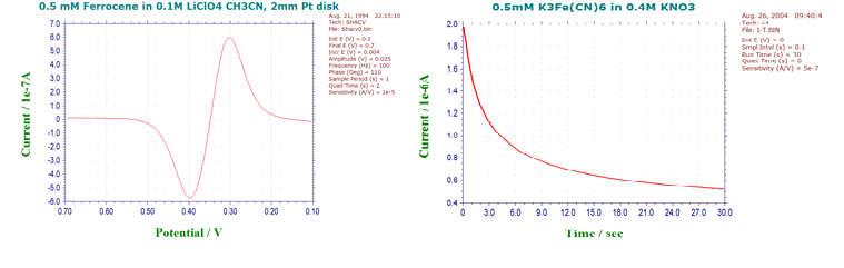 恒電位儀 零阻電流計 2,3,4電結構 浮動地線或實地 大電位范圍:±10V 大電流:±250mA連續(xù),±350mA峰值 槽壓:±13V 恒電位儀上升時間:小于1s,通常0.8s 恒電位儀帶寬(-3分貝):1MHz 所加電位范圍:±10mV, ±50mV, ±100mV, ±650mV, ±3.276V, ±6.553V, ±10V 所加電位分辨:電位范圍的0.0015% 所加電位準確度:±1mV,±滿量程的0.01% 所加電位噪聲:<10V均方根植 測量電流范圍:±10pA至± 測量電流分辨:電流量程的0.0015%,低0.3fA 電流測量準確度:電流靈敏度大于等于1e 輸入偏置電流:<20pA 恒電流儀( 660E) 恒電流范圍:3nA–250mA 所加電流準確度:如果電流大于3e 所加電流分辨率:電流范圍的0.03% 測量電流范圍:±0.025V,±0.1V,±0.25V,±1V,±2.5V,±10V 電位計 參比電輸入阻抗:1e12歐姆 參比電輸入帶寬:10MHz 參比電輸入偏置電流:<=10pA @ 波形發(fā)生和數(shù)據(jù)獲得系統(tǒng) 快速信號發(fā)生更新速率:10MHz,16位分辨 快速數(shù)據(jù)采集系統(tǒng):16位分辨,雙通道同步采樣,采樣速率每秒1,000,000點 外部信號記錄通道高采樣速率:1MHz 可拓展掃描電化學顯微鏡功能 |