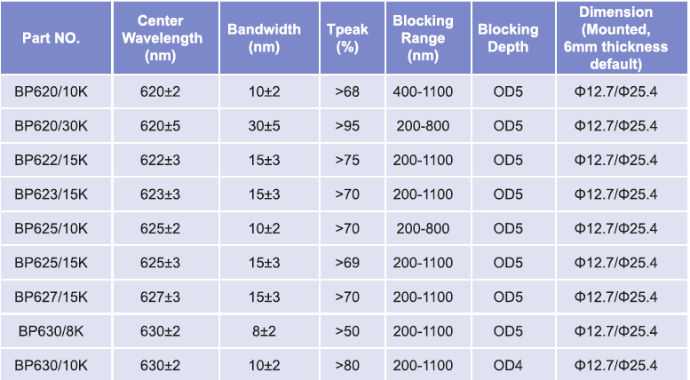 帶通濾光片波長范圍:620nm-630nm