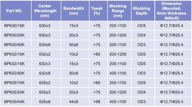 帶通濾光片波長范圍:630nm-635nm
