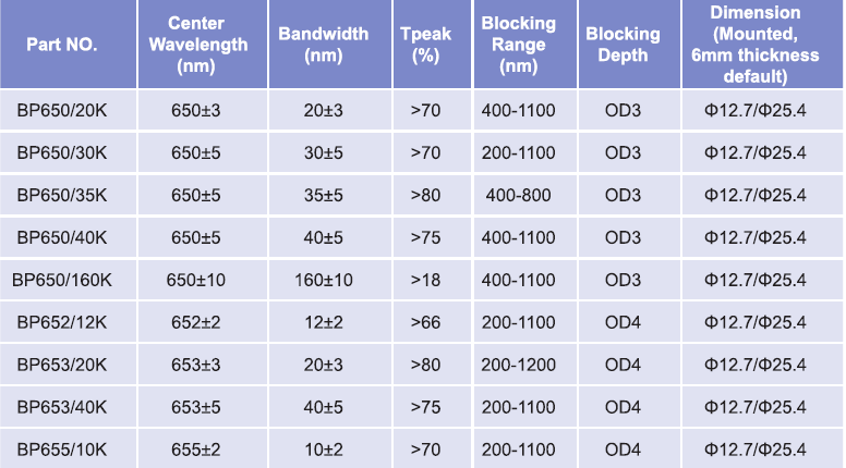 帶通濾光片波長范圍:650nm-655nm
