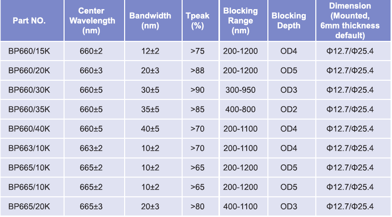 帶通濾光片波長范圍:655nm-660nm