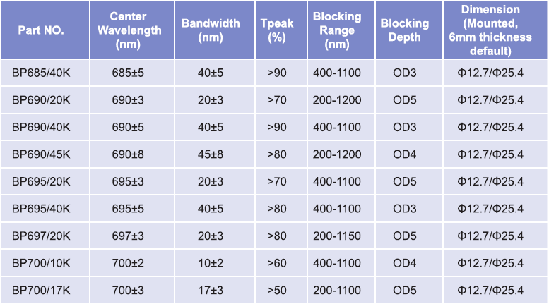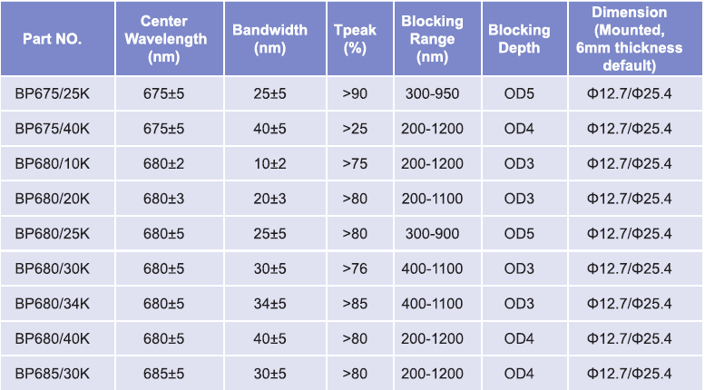 帶通濾光片波長范圍:665nm-675nm