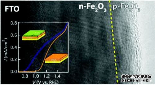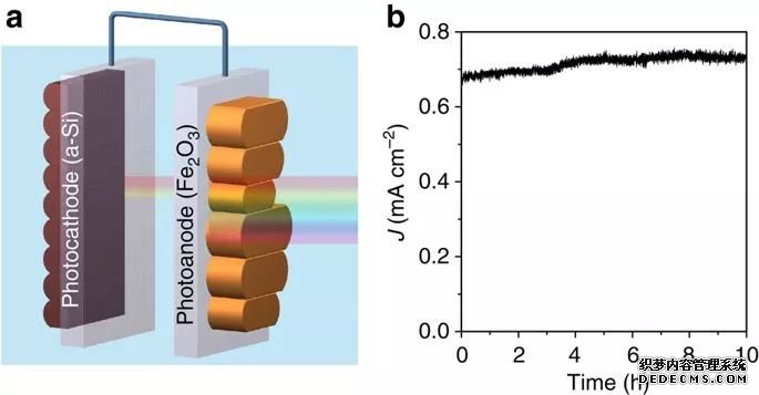 Dunwei Wang課題組發(fā)表在Nature Communications的一篇工作中,在通過(guò)Fe2O3光陽(yáng)和非晶Si光陰組成的器件,獲得了當(dāng)時(shí)高約0.9%的太陽(yáng)能轉(zhuǎn)化效率;(上圖,DOI:10.1038/ncomms8447)