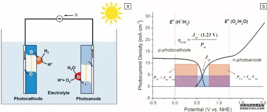 圖1 p-n 疊層光電化學(xué)水分解電池示意圖(a) 和性能曲線(xiàn)(b)
