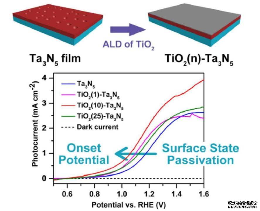 天津大學(xué)鞏金龍教授課題組通過(guò)ALD的方法在Ta3N5上沉積了10 nm厚的TiO2,減少了表面復(fù)合,降低了100 mV左右的開(kāi)啟電勢(shì)。為了獲得較薄且均勻的鈍化層,一般都 使用濺射或ALD 等方法。(上圖,DOI:10.1039/C6CC03411J)