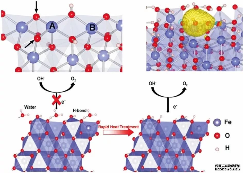 羅文俊課題組發(fā)現(xiàn)通過(guò)高溫短時(shí)間煅燒除去α-FeOOH 表面吸附水的方法,可以提高α-FeOOH 的產(chǎn)氧活性和穩(wěn)定性,通過(guò)理論計(jì)算發(fā)現(xiàn),表面吸附水會(huì)與FeOOH 表面的O形成強(qiáng)的氫鍵,影響活性位點(diǎn)對(duì)OH- 的吸附和氧化,從而影響了其產(chǎn)氧的活性。 (DOI:10.1039/C6TA08719A)