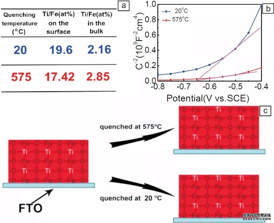 除了在材料制備后對(duì)表面偏析相進(jìn)行處理外,黃維院士團(tuán)隊(duì)對(duì)Fe2O3的煅燒過(guò)程進(jìn)行改進(jìn),發(fā)現(xiàn)通過(guò)短時(shí)間淬火的方式,能夠在制備過(guò)程中就降低表面的偏析、提高體相摻雜濃度,從而提高Fe2O3電的性能。XPS表征發(fā)現(xiàn),通過(guò)短時(shí)間高溫淬火可以有效降低Fe2O3表面的Ti偏析, 莫特肖特基曲線(xiàn)也發(fā)現(xiàn)高溫淬火后的載流子濃度相比于 常溫取出的Fe2O3高了6 倍,因此他們認(rèn)為高 溫淬火的方式可以將摻雜離子固定在材料晶格內(nèi)部,防止向表面偏析,從而減小表面復(fù)合,提高材料光電化學(xué)性能。(上圖,DOI:10.1002/cnma.201600108)