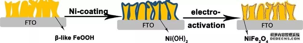 隨后他們制備了亞穩(wěn)態(tài)、大孔道結(jié)構(gòu)的類(lèi)β相( schwertmannite) FeOOH 薄膜電,并且在其表面負(fù)載了少量 Ni(OH)2。在外加偏壓下,覆蓋在亞穩(wěn)態(tài)類(lèi)β相FeOOH表面的Ni2+會(huì)以某種離子或離子團(tuán)的形式進(jìn)入到類(lèi)β相 FeOOH 的結(jié)構(gòu)孔道,與孔道周邊的Fe原子成鍵形成 NiFe2O4,使得雙層催化劑的產(chǎn)氧活性和穩(wěn)定性都大幅提升。α-FeOOH的晶型結(jié)構(gòu)穩(wěn)定,沒(méi)有大孔道。因此在外加偏壓下,α-FeOOH/Ni(OH)2并沒(méi)有展現(xiàn)出特殊的變化,僅是單純性能的疊加,產(chǎn)氧活性也小于β-FeOOH/Ni(OH)2。因此,在FeOOH、NiOOH雙層電催化劑中,F(xiàn)eOOH 的晶相對(duì)Fe/Ni 雙層結(jié)構(gòu)催化劑的性能有較大影響。(DOI:10.1002/asia.201700964)