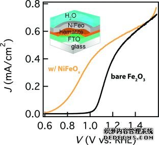 但目前在Fe2O3上降低開(kāi)啟電勢(shì)有效的催化劑為NiFeOx。關(guān)于Fe2O3的開(kāi)啟電勢(shì)差,Dunwei Wang課題組認(rèn)為是由于Fe2O3大量的表面態(tài)導(dǎo)致費(fèi)米能級(jí)釘扎,通過(guò)NiFeOx助催化劑的引入,大程度降低了表面費(fèi)米能級(jí)的釘扎效應(yīng),因此獲得了較好的開(kāi)啟電勢(shì)。(上圖,DOI:10.1002/anie.201306263)