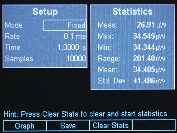 能夠進(jìn)行脈沖峰間測量,在樣本速率為250 kHz 時(shí),重復(fù)頻率高達(dá)4 kHz。脈沖、峰間和DC 光源測量可以W、dBm、dB、J、A、V 和Sun 等為單位進(jìn)行顯示,取決于使用的探測器類型。